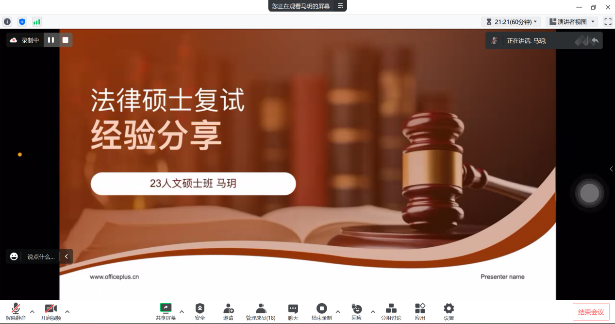 随后,马玥学姐向我们分享了她的考研复试经验与法律硕士跨考经历。在面试过程中,马玥学姐着重强调了英语口语的流利度和准确度的重要性。同时,简历制作也非常重要,学姐建议在简历中简洁明了地展示自己的基本信息、特长和过往经历。此外,学姐还强调了复试现场的重要性,复试是个人综合能力的一个全面展现,在复试过程中要保持冷静沉着,展现出积极阳光的一面。
