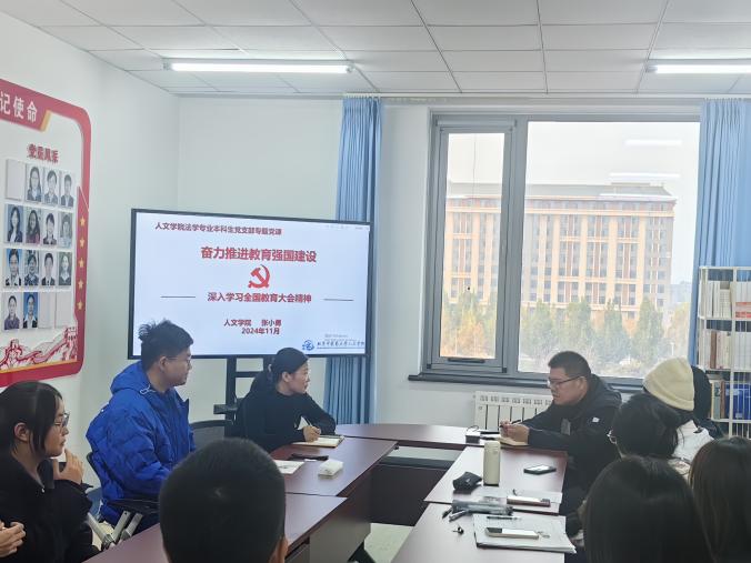 2024年11月7日下午,人文学院法学专业本科生党支部于人文学院401党员之家,开展了以“深入学习全国教育大会精神,奋力推进教育强国建设”为主题的专题党课活动。人文学院张小勇书记为主讲人,人文学院法学专业本科生党支部12名党员同志全程参与此次活动。会议由人文学院法学专业本科生党支部书记刘玉主持。