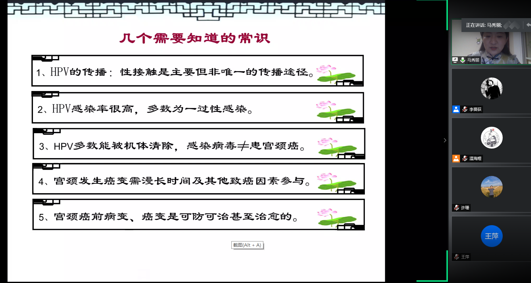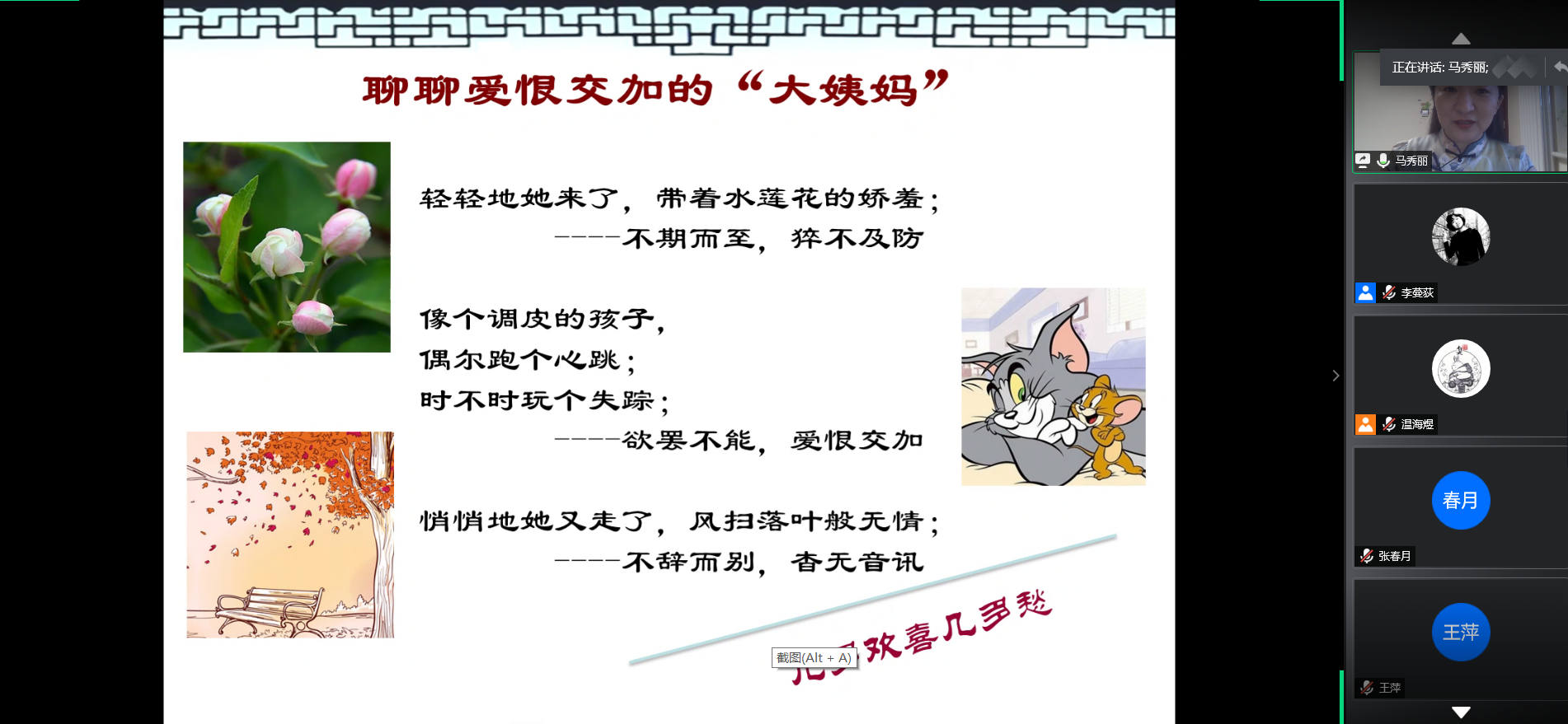 2020年5月23日晚19:00,人文学院分工会举办了一场以“如何守护您的秘密花园--聊聊女性妇科保健那些事儿”为主题的线上讲座活动,本次讲座邀请了北京中医药大学东直门医院妇科马秀丽主任,由人文学院分工会主席李蔓荻副书记主持,学院教师积极参与,反响热烈。