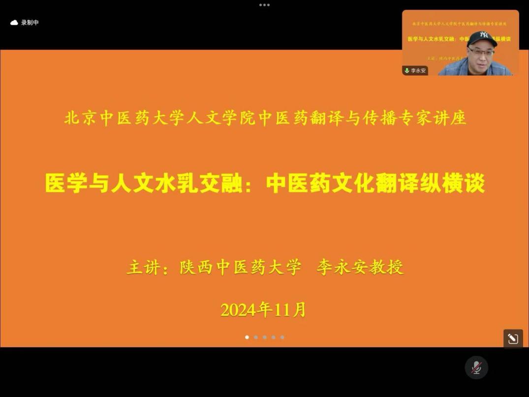 2024年11月18日晚19点,人文学院特邀陕西中医药大学外语学院院长李永安教授通过线上腾讯会议方式为人文学院师生带来“医学与人文水乳交融:中医药文化翻译纵横谈”专题讲座。人文学院英语教师和学生近八十人参加讲座,讲座由孔祥国副院长主持。