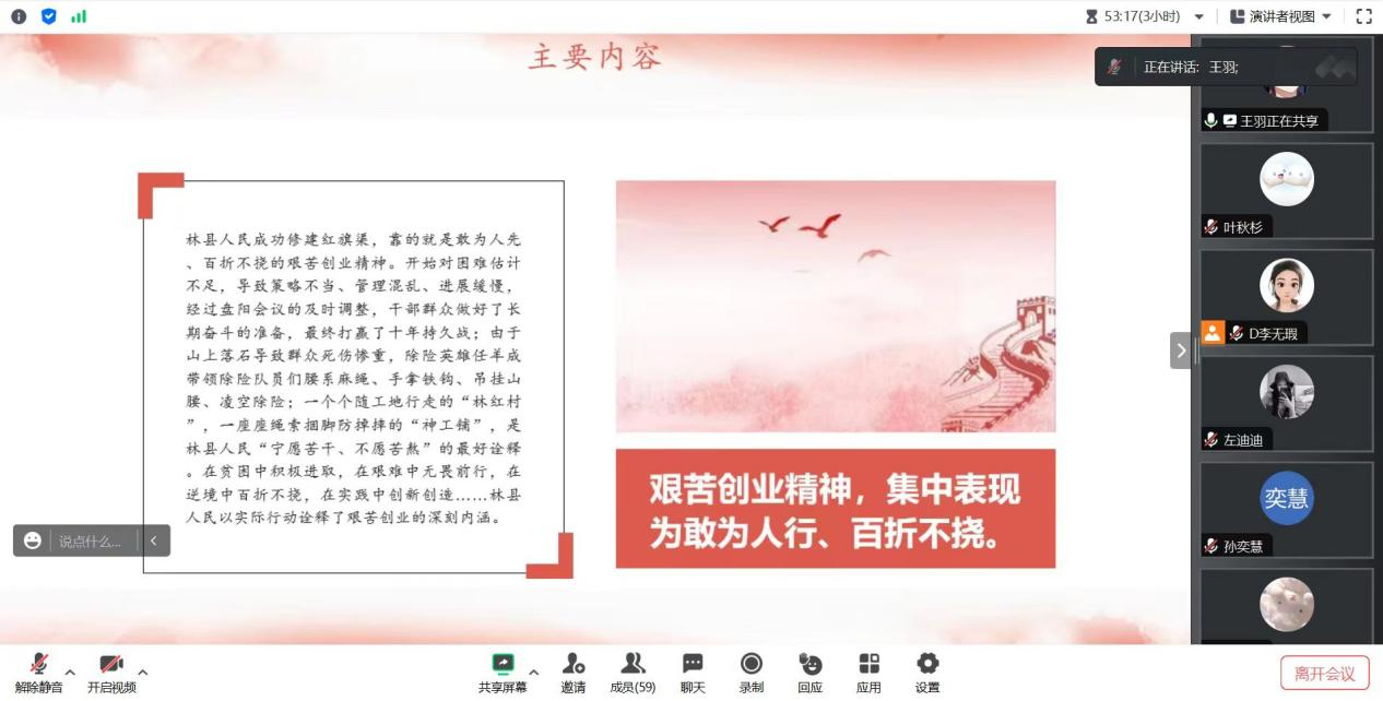 中国人民公安大学申雅心、叶林同志,法学专业学生党支部王羽、叶秋杉同志分别对她们理解的红旗渠精神进行了分享。申雅心和叶林同学通过一则视频,带领同学们感受青年建渠英模吴祖太的时代精神,强调新时代青年要传承红旗渠精神;王羽和叶秋杉同学先讲述了红旗渠的历史渊源,介绍了修建红旗渠的过程,点明红旗渠对当地人民的生产生活质量发挥着不可磨灭的作用;随后两位同学还谈了自己的学习感悟,鼓励大家深度挖掘红旗渠精神的深刻内涵和时代价值,砥砺奋斗,成长为社会主义合格建设者和接班人。