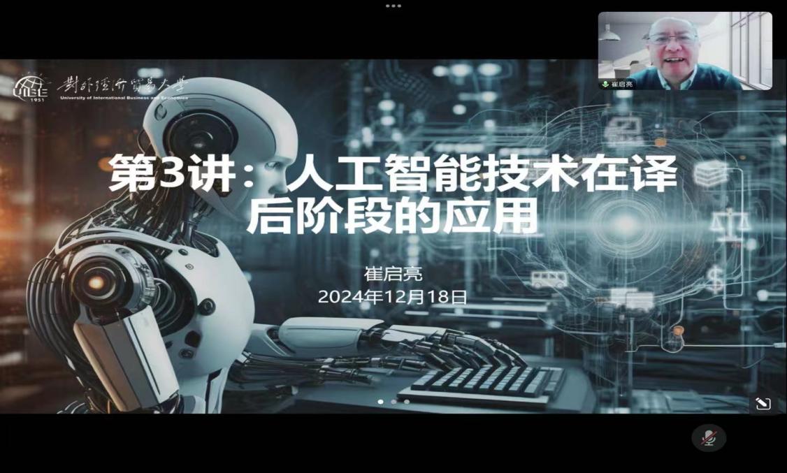 2024年12月18日晚19点,人文学院特邀对外经济贸易大学崔启亮教授通过线上腾讯会议方式为人文学院师生带来系列讲座第三场之“人工智能技术在译后阶段的应用”专题讲座,讲座由孔祥国副院长主持。
