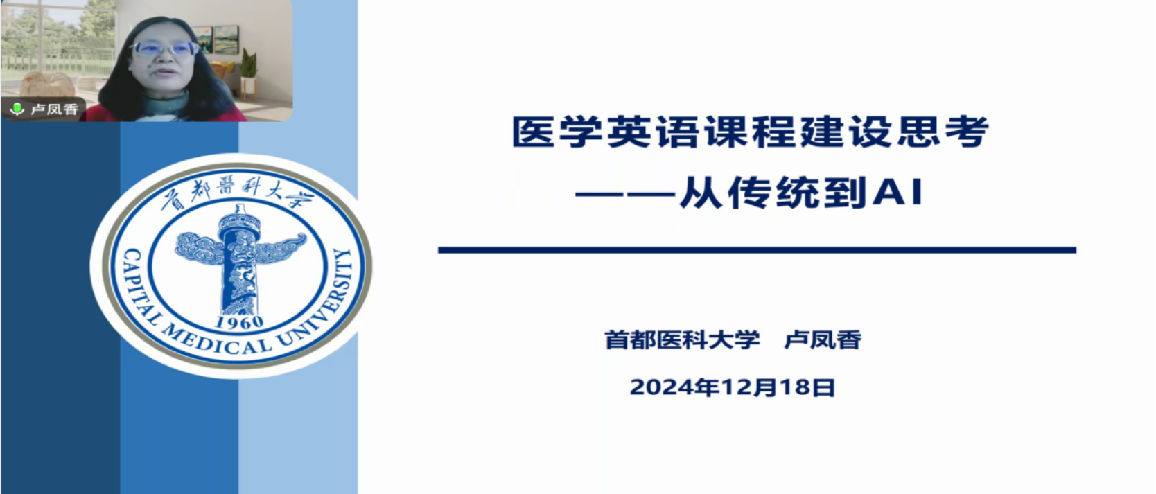 2024年12月18日上午,人文学院特邀首都医科大学医学人文学院院长卢凤香教授通过腾讯会议方式为学院英语教师带来题为“医学英语课程建设思考─从传统到AI”的专题讲座,讲座由孔祥国副院长主持。