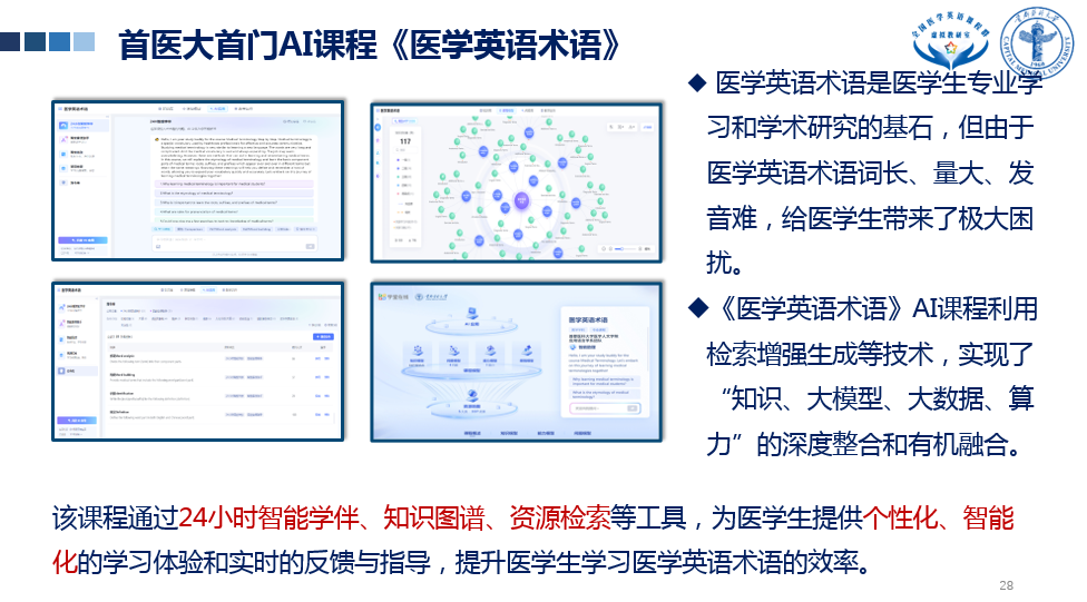 卢教授特别强调,医学英语教师应紧跟数字化转型趋势,积极承担时代责任,提高个人综合素养,在此基础上做好课程建设。她指出,医学院校英语教学改革应聚焦体系化设计,以语言为传递载体,以专业为坚实依托,利用人工智能推进外语学科与现代前沿技术的深度交叉与融合。卢教授以首都医科大学和清华大学携手打造的AI课程为范例,强调医科院校英语教师应敏锐捕捉发展机遇,勇于变通,紧跟时代赋能趋势,推动医学英语教学实现创新发展。