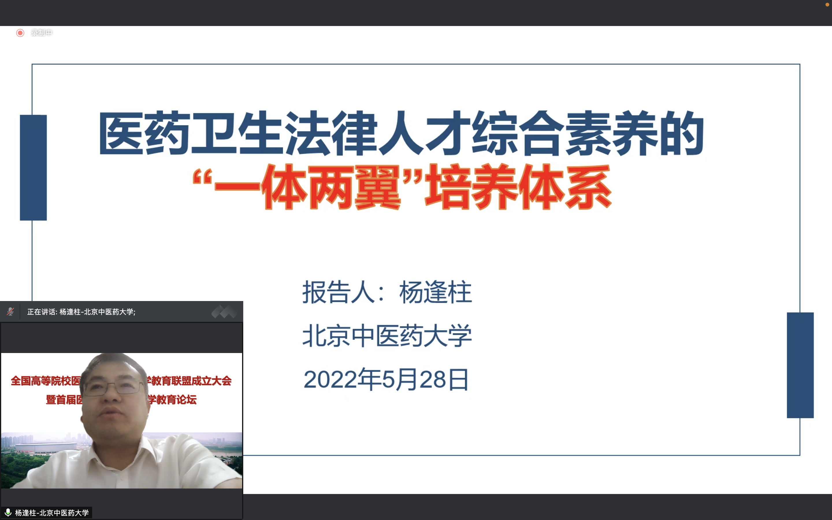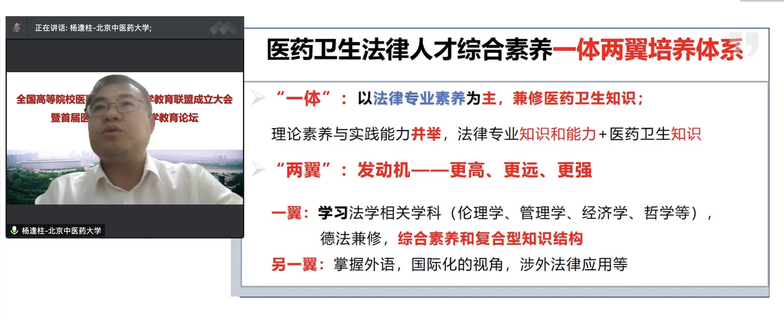 在活动中,我院杨逢柱副教授受邀担任全国高等院校医事(卫生)法学教育联盟副理事长,并根据我院承担的2021年教育部新兴文科专业建设探索与实践项目《新兴文科医药卫生法学专业建设探索与实践》的研究成果,以《医药卫生法律人才综合素养的“一体两翼”培养体系》为题做主题报告。