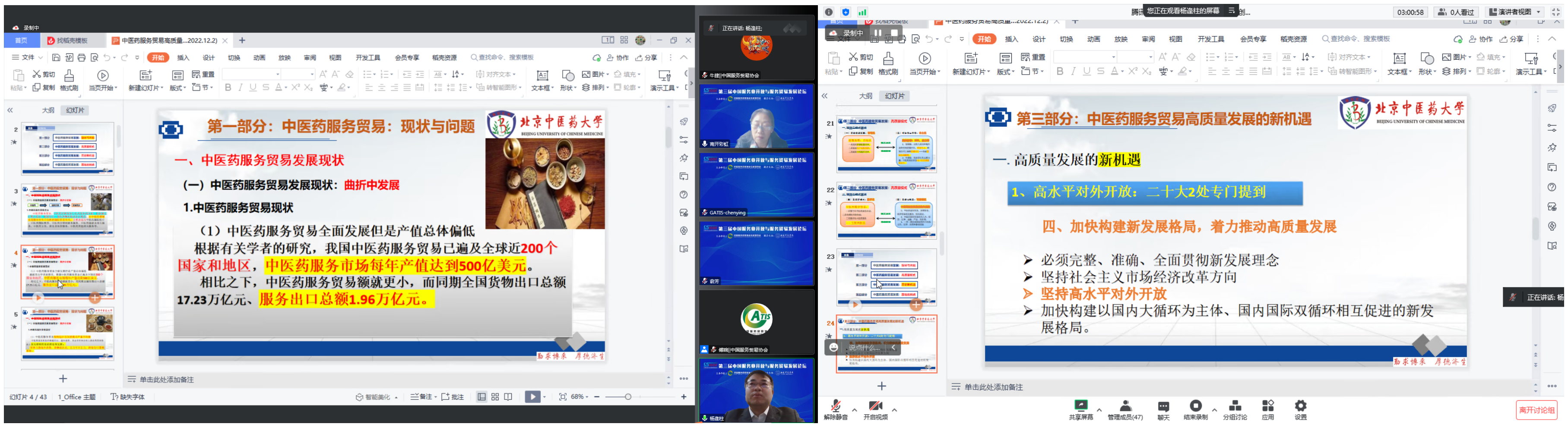 我院法律系主任杨逢柱副教授以《中医药服务贸易高质量发展的机遇与挑战》为题做主题报告。报告从中医药服务贸易发展现状与问题、中医药服务贸易发展高质量要求、中医药服务贸易机遇与挑战等角度,总结了中医药服务贸易发展的历史成就,分析了中医药服务贸易发展存在的问题及原因,指出了中医药服务贸易高质量发展的特点和需求,明确了中医药服务贸易“市场化、本土化、数字化和系统化”等高质量发展的方向,剖析了中医药服务贸易发展的重大历史机遇——“高水平对外开放政策”和“数字化浪潮”,提出了破解中医药服务贸易高质量发展的国内法律和国际法律对策。本次报告引起与会专家的重视,并推动了对于中医药服务贸易高质量发展的深入思考。