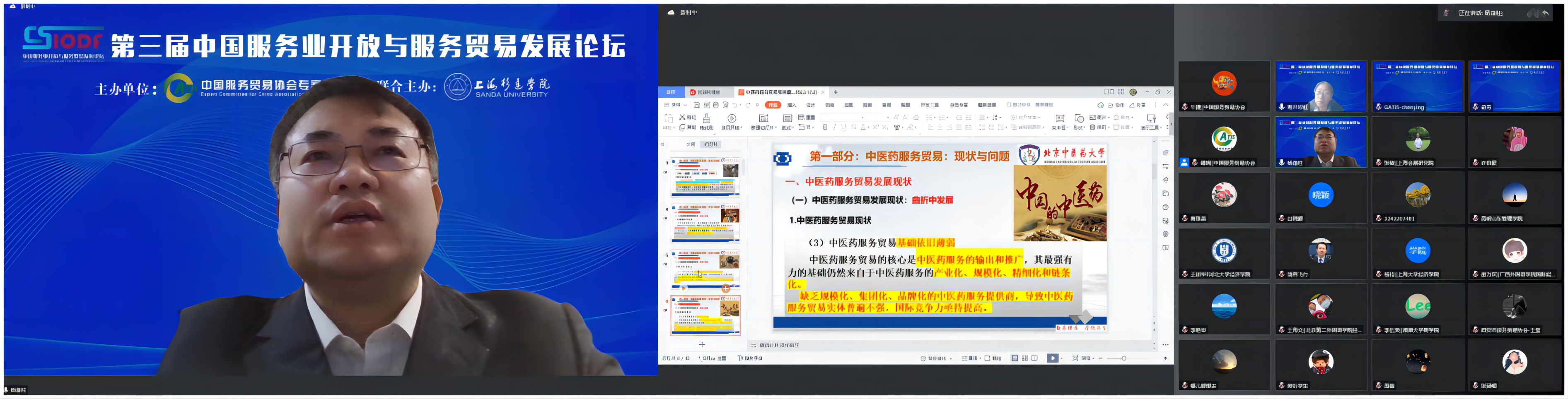 2022年12月2日,我院法律系主任杨逢柱副教授应邀参加由中国服务贸易协会专家委员会主办第三届中国服务业开放与服务贸易发展线上论坛并做主体报告。来自中国科学院、国务院发展研究中心、国家发展和改革委员会对外经济研究所、商务部研究院国际服务贸易研究所、中国人民公安大学、中国政法大学、中央财经大学等30余家服务贸易研究单位的60余名专家参加了本次论坛。