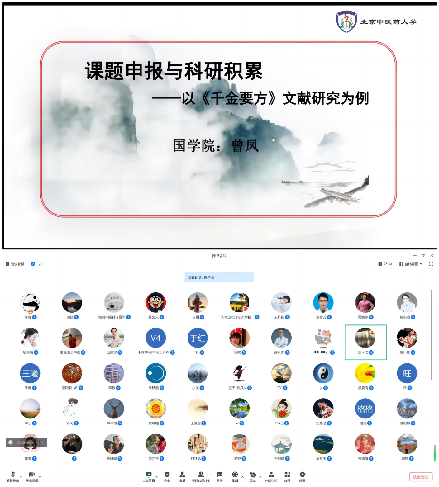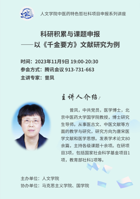 为了进一步提升我院人文社科的科研能力和水平,更好地营造追求卓越的学术氛围,2023年11月9日晚,北京中医药大学国学院教授、博士研究生导师曾凤教授通过腾讯会议为各学院教师作题为“科研积累与课题申报——以《千金要方》文献研究为例”的学术讲座。讲座由人文学院副院长陈子杰教授主持,100余名教师聆听了讲座。本次中医药特色哲社科项目申报系列讲座由人文学院主办,马克思主义学院和国学院协办。