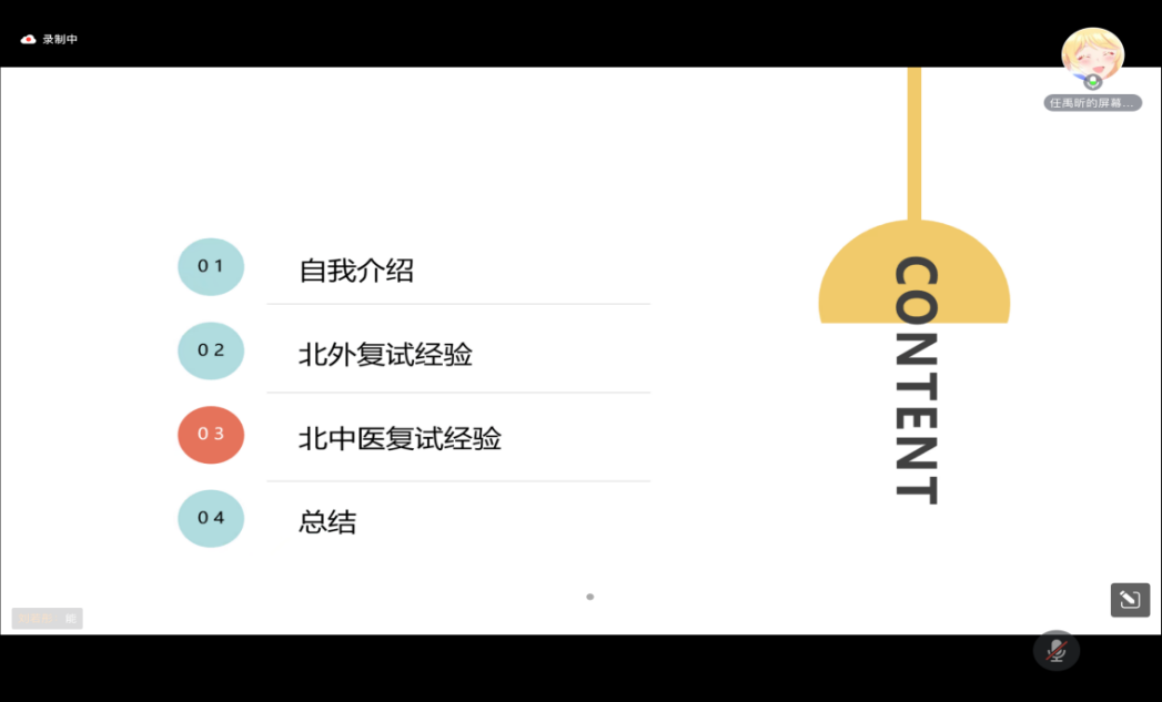 之后,任禹昕学姐则分别向我们介绍了北京外国语大学和北京中医药大学两所学校的复试经验。北外的复试重视表达灵活性测试;北中医的复试则着重强调中医药英语的知识内容。学姐总结了几点复试建议:寻找水平相当且有效的搭子共同学习;坚持每天学习,持之以恒;练习、考试后都及时复盘;保持平和乐观的心态。