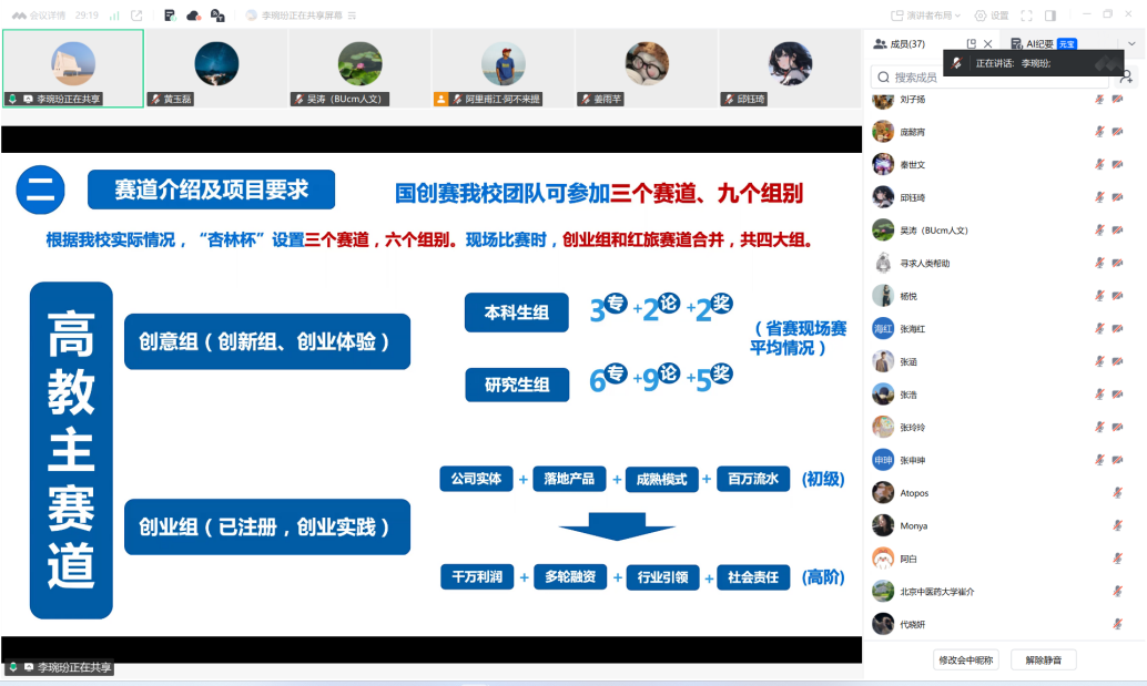 为帮助学生全面了解“杏林杯”创新创业大赛政策体系、赛道规则及学院工作安排,明确备赛方向、激发参赛热情,人文学院于2026年1月21日举行“杏林杯”大学生创新大赛线上培训会。本次培训邀请招生与就业处李琬玢副处长担任主讲,人文学院党委副书记吴涛主持培训会。