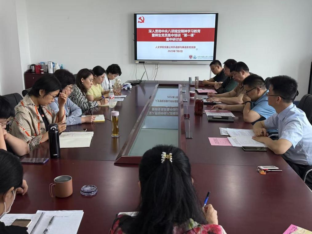 2025年7月2日,公共外语部与英语系党支部召开深入贯彻中央八项规定精神学习教育暨师生党员集中培训“第一课”集中研讨会。支部全体党员,联系支部的校领导闫振凡副校长,人文学院党委书记张小勇、院长陈锋、党委副书记吴涛参加研讨会。会议由支部书记陈秋云主持。
