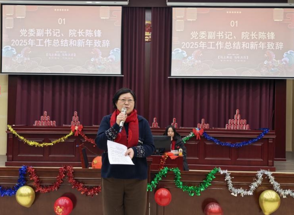 大会在庄严的氛围中拉开帷幕。院长陈锋首先作学院年度工作报告。她以详实的数据,系统回顾了2025年学院在党建引领、学科建设、教育教学改革、科研创新、师资队伍建设、人才培养质量以及社会服务拓展等方面取得的成绩。陈院长说,这些成绩的取得,得益于学校党委的坚强领导和各职能部门的大力支持,更得益于全院教职工的智慧与拼搏。她代表学院向全院教职工致以最诚挚的感谢,并勉励大家在新的一年里,以“天马启文”的开拓精神,共同创造“岁稔年丰”的新业绩。