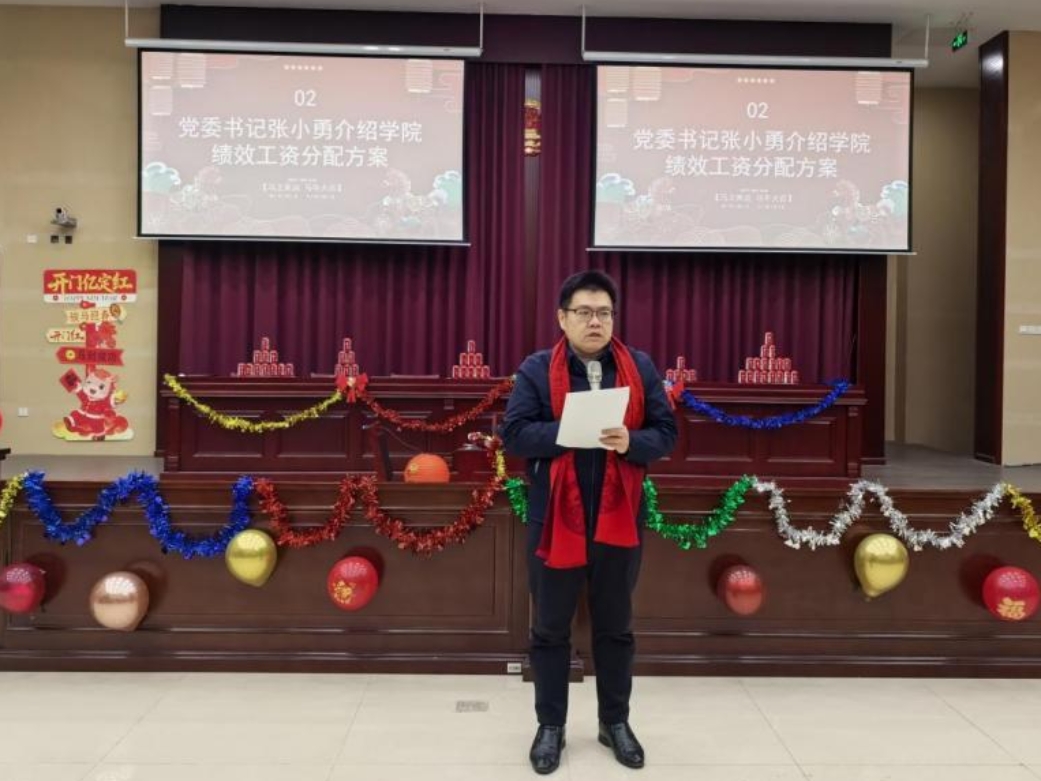 学院党委书记张小勇作新年致辞,他代表学院党委对全体教职工一年的辛勤付出表示感谢,并为全院师生送去新年祝福,同时勉励大家要在十五五规划开启之年、学校落实教育强国建设三年行动计划攻坚之年、建校七十周年之际做出人文学院应有的贡献。会上,张小勇书记还在前期征求意见的基础上就学院2025年度绩效分配方案进行了通报说明。