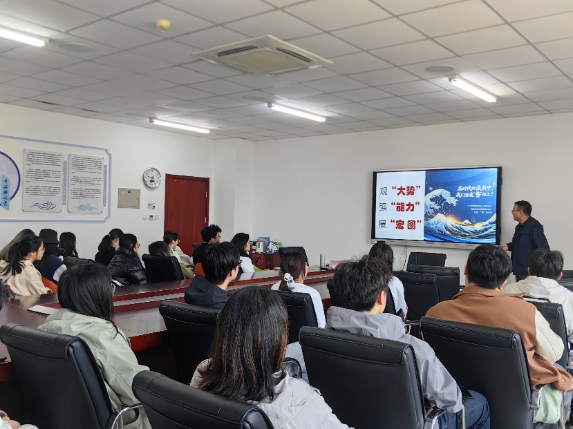随后,学院党委副书记吴涛老师结合学院就业工作实际,为同学们梳理了毕业季关键时间节点,详细介绍了考研、考公、企业招聘等主要就业路径的时间安排与准备策略。他提醒同学们要早规划、早行动,把握秋招、春招等黄金时期,理性评估自身优势,早日明确下一阶段的发展方向。