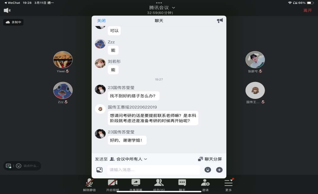 在最后的答疑环节上,两位学姐对我校英语本科专业同学们提出的的问题进行了细致解答,给出了考研方向选择,日常专业学习,以及不同学校研究生专业区别等方面的专业回答,帮助同学们更好地了解了英语专业考研相关的情况。