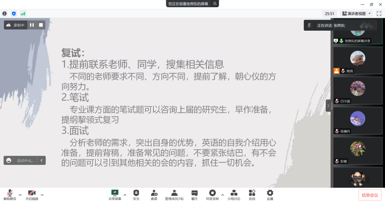 首先,张煦东介绍了中医类专业复试的经验。复试前需要提前联系老师和同学搜集相关信息,笔试方面建议提纲挈领式复习,面试要分析老师的需求,突出自身的优势,抓住一切有利于自己的因素。