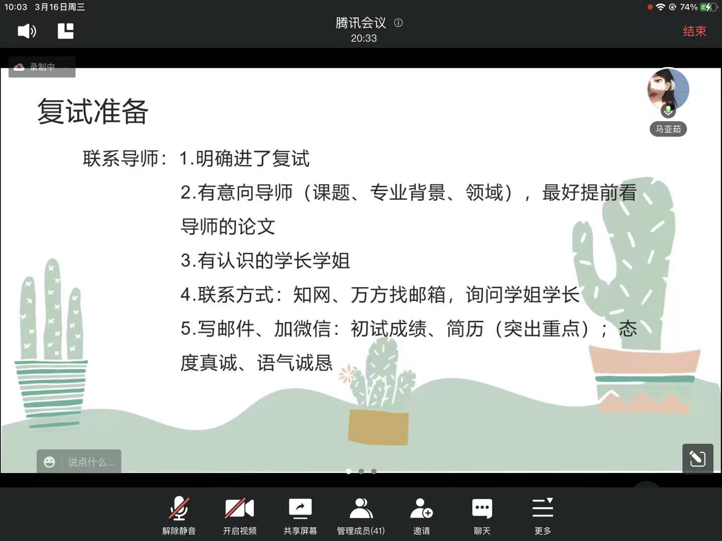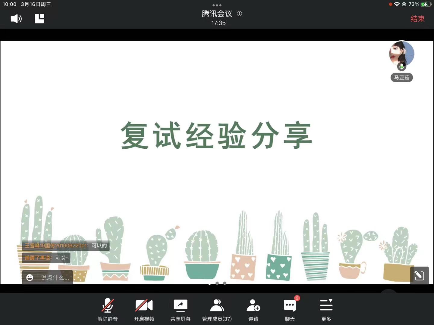 为帮助2022届毕业生做好复试准备、2023届毕业生做好考研规划等,人文学院于2022年3月16日上午在腾讯会议召开“2022英语专业考研经验分享会”,会议邀请到21级硕士班的马亚茹学姐和姜卓呈学长为同学们做分享,人文学院就业专员刘玉老师及2018级、2019级英语专业学生参加会议,会议由就业联络员李佳琪主持。